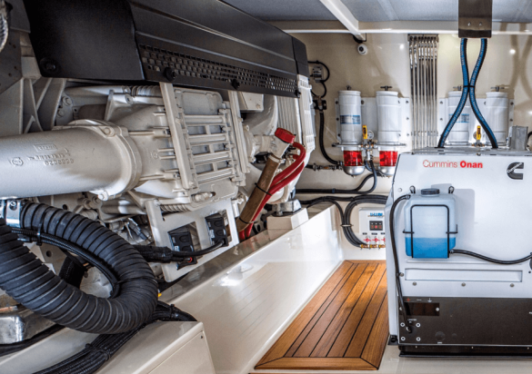 The spotless engine room of a Grand Banks has plenty of space for multiple batteries, but anything that saves space and cuts weight is good, even on a sizeable yacht. (Grand Banks)