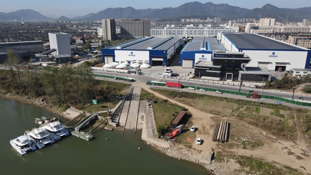 In 2012, Sino Eagle Group, J&J Design Group, Seaway and MarineMax collaborated to expand the Aquila range by developing a new, purebred power cat. The result was the first true Aquila Power Catamaran, the Aquila 48. Based in Hangzhou City, China, Sino Eagle Group, recognised as a leader in high-tech composite manufacturing, established a dedicated new Aquila factory in 2012, which provided the Aquila brand with full in-house manufacturing capabilities. This has since been expanded with the 110,00 sqm site comprising four massive construction buildings, an indoor test pool, riverside launching facilities and an ultra-modern administration block. Aquila’s complex in Hangzhou is impressive. Hangzhou is often revered as one of the most beautiful cities in China, and the Aquila factory reinforces that sentiment. State-of-the-art is an often-misused description of a modern, technologically advanced production facility, but in the Aquila factory’s case, it is absolutely warranted. While the factory has not gone to full robotics, they prefer to use a dedicated staff of 510 artisan tradesman and admin staff, the construction methods, quality control, and overall management of every aspect is exceptional. Their aim is for perfection in every aspect of the build process. It is also a ‘green’ factory with every effort made to reduce emissions. Sino Eagle Group have invested heavily in environmental protection to look after the environment and their employees. There are expansive solar panels on top of the factory roof, designated cutting rooms with strong evacuation fans to prevent dust collection inside the factory and a filtration system for grey water.