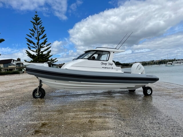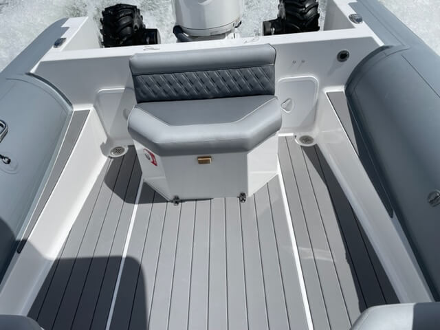 Based on a completely new 8m hull, (9.1m including sponsons) the boat has a flat transom, and D shape pontoons which to provide more room at the rear. The deep 25.5 deg deep V at the transom gives a soft ride but with a stable platform while underway and at rest.