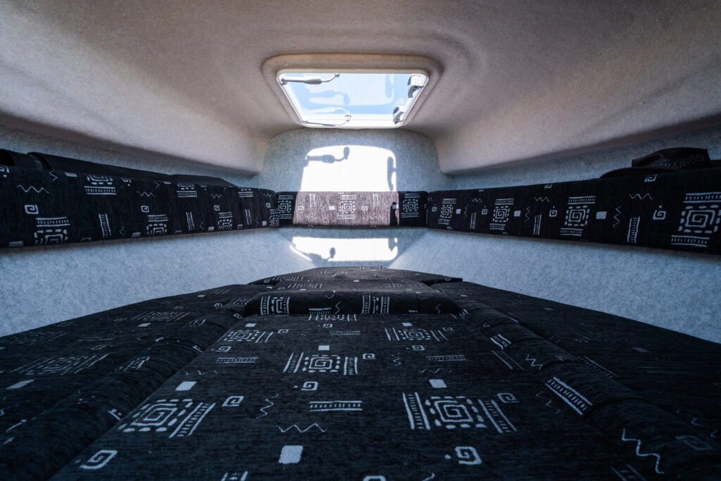 Up front there is a traditional cabin, with an infill converting it to a full berth. Though a toilet isn’t fitted on this boat, one can be, and a privacy curtain can also be added.
