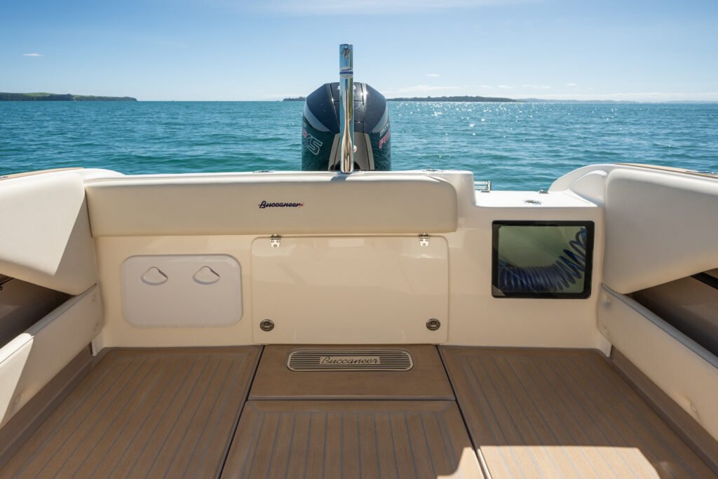 Across the stern there is a movable bin seat, a standard feature, which provides plenty of seating and storage options for the whole family.