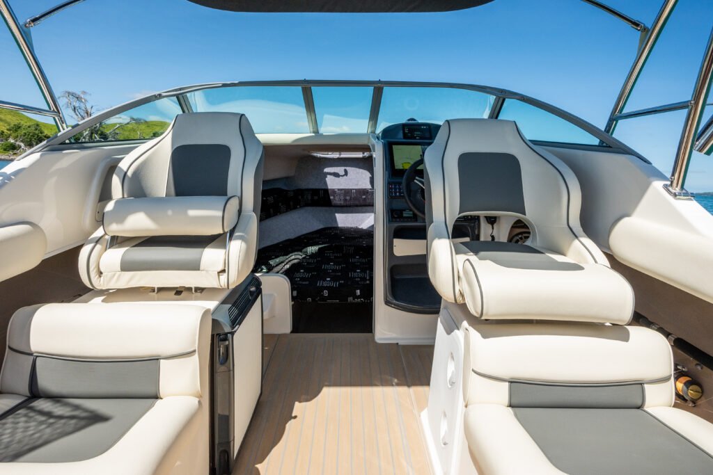 Speaking of seats, this boat comes with newly introduced forward-facing swivel captain’s seats with bolsters up front, and lower rear-facing seats with storage underneath. However, you can also opt for traditional pedestal seats, or a more classic King/Queen arrangement.