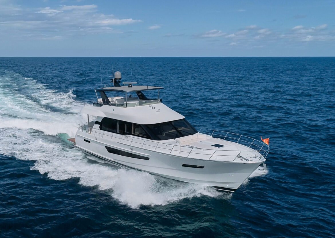 Comfortable accommodations on CLB65 give the owner the most stable space, by being low and in the centre of the hull with a VIP cabin forward and an ensuite guest cabin between them. This creates a usable corridor space with storage that includes the washer and separate dryer. Access to tankage is also easy here, with all liquids, including fuel, stored in moulded-in fibreglass tanks, located low and along the keel, which also aids stability. Other good features are the natural light coming down from the tall front saloon window and the wide stairs for access. Inside the owner’s a king-sized bed runs fore and aft with the wide beam really showing here to give generous floor space. On each side, there’s stylish walnut-clad cabinetry with cedar-backed closets, while the cream walls contrast well with the darker wood to give a contemporary feel. Generous headroom is another plus, along with the ample natural light from the portlights (with opening portholes). Yet another feature owner-drivers will appreciate is the bulkhead door directly into the engine room, which is also an escape route. Ablutions are on the starboard side towards the bow and maximise the space (that could be a fourth cabin) to create a spacious bathroom. His and her sinks, made in elegant composite curved stone, set the tone, with lockers and generous mirror space, along with a Tecma electric freshwater head.