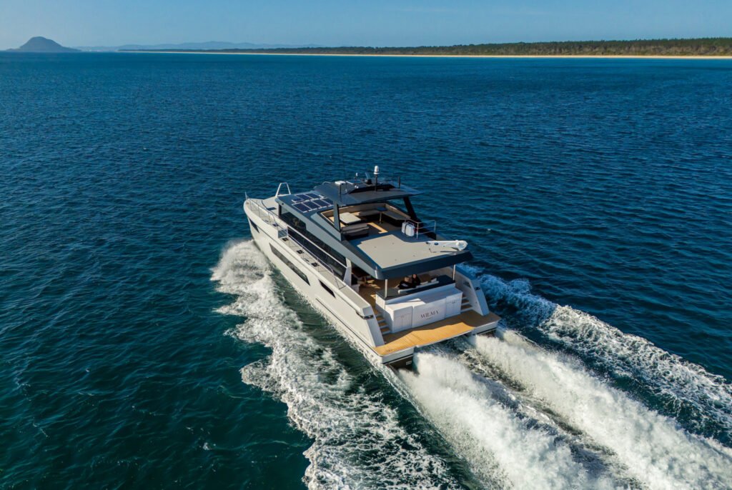 Called Wilma², it was a very impressive 18.3m Roger Hill semi-displacement power catamaran capable of over 28 knots but, more importantly, offering true “range at speed”. Able to cruise comfortably at 18-21 knots in almost all conditions, it completed its trans-Tasman delivery voyage in just 3 days, 3 hours, testing neither fuel reserves nor crew.