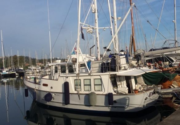 We’re in Corfu’s Gouvia Marina with our friend Chris aboard berthed next to a sturdy 18 m British wooden ketch called Acco, built in 1938. Boats like these are always much more interesting than their modern counterparts and Dave and Gwen Nicholson have owned her since 1968, spending the past 20 years or so living an alternative lifestyle aboard, mostly in Corfu.