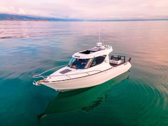 Visitors to the recent Tairua Boat Show will have seen the new pristine white, DNA 801 Custom. This latest offering from this very progressive Nelson boat builder sets new standards in finish, style and presentation, that didn’t go unnoticed by show patrons. Designer/builder Jason Elvines said he had a great response and last week was working with a number of clients interested in the 801 Custom.