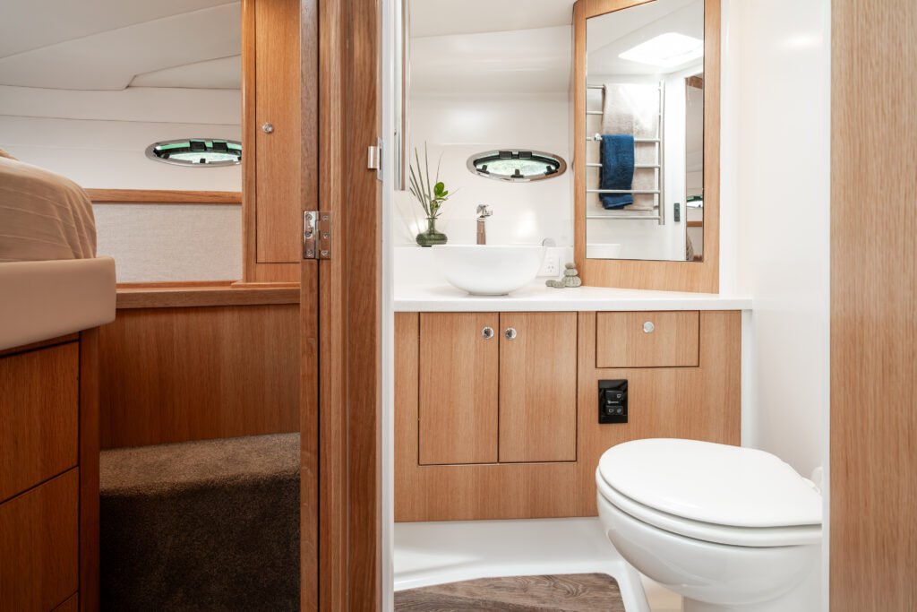 A particularly nice feature is the separate shower to port, opposite the head to starboard, with strategically placed doors ensuring privacy from the rest of the boat.