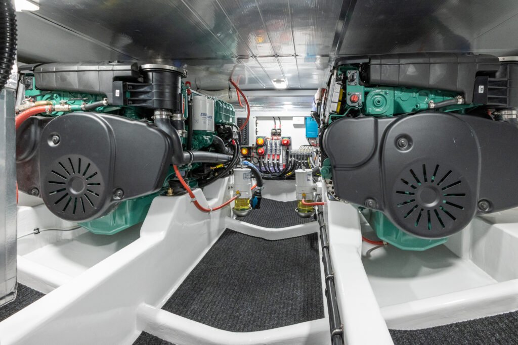 Upfold designed the hull mould so it can be adapted for the installation of single or twin engines, IPS drives or even jet units. ‘We wanted to offer as many options as possible, in twin and single engine installations,’ he says. Ikō’s owners enjoy long range coastal cruising, so they selected twin Volvo Penta D6s