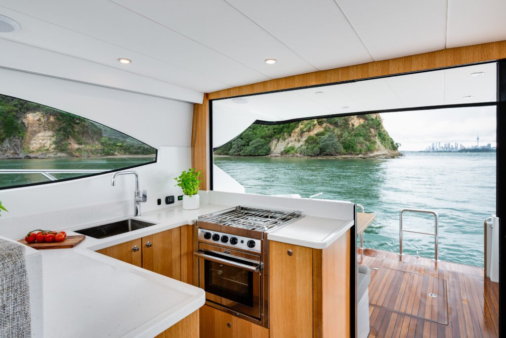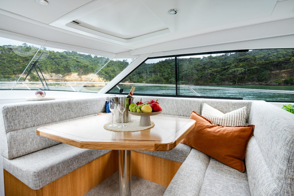 Customers often visit Allan Tongs Boatbuilders in Auckland as their boat takes shape and work on their individual décor with Ester. ‘We’ve got a couple of real artisans working for us,’ Ester says, ‘like Jase, who does our cabinetry. He does a beautiful job with inlays, for example, in the saloon table. Because we’re a custom boatbuilder, we can do some modifications, and this particular boat is a good example of that.’