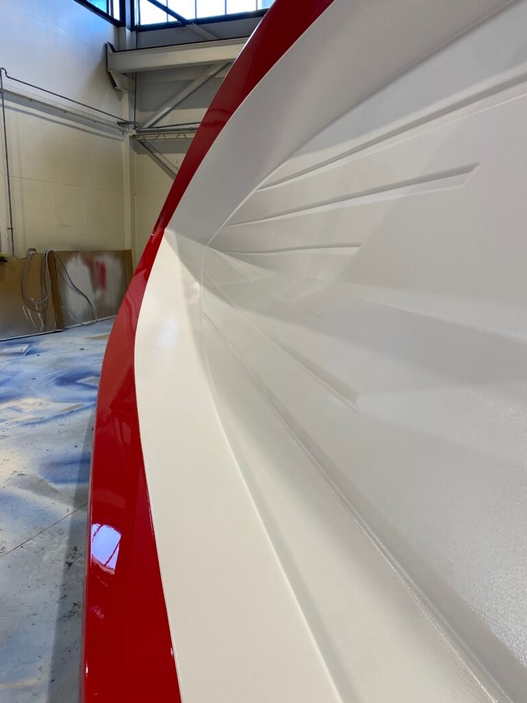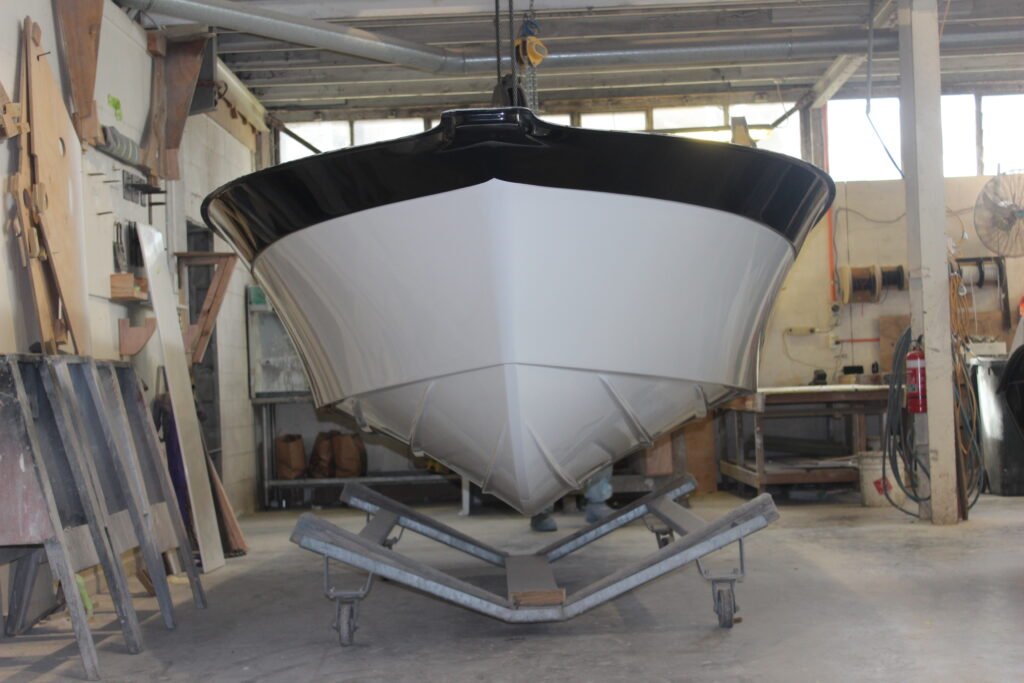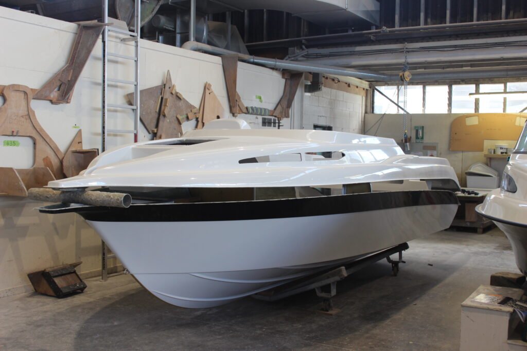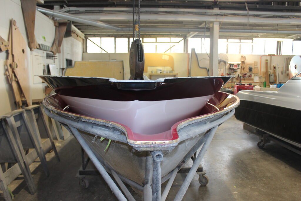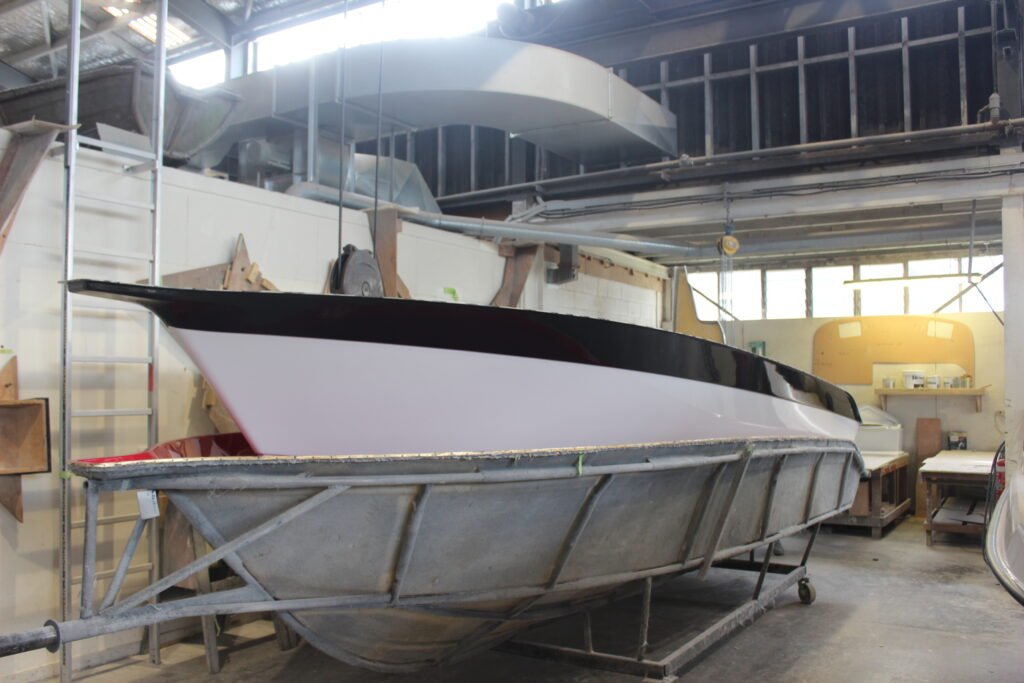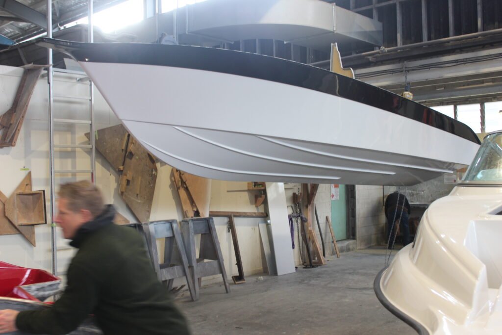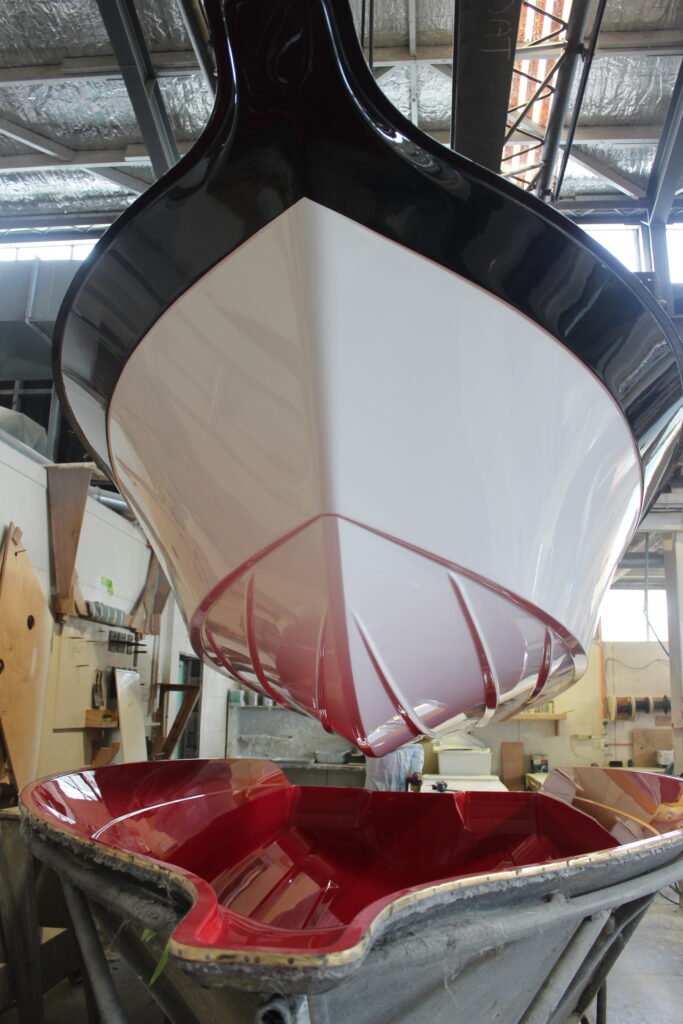 The black topside strip is also gel-coat and is applied after the hull’s white gel has been applied and has dried.