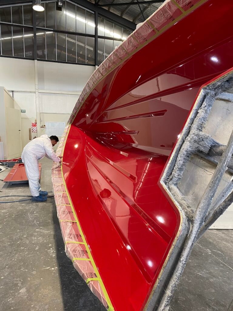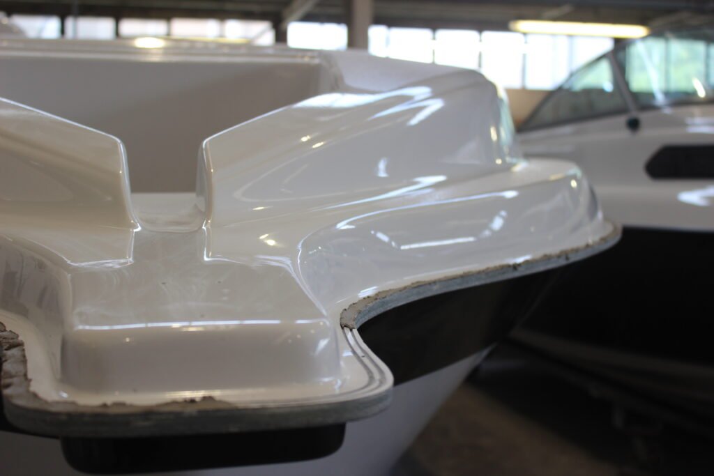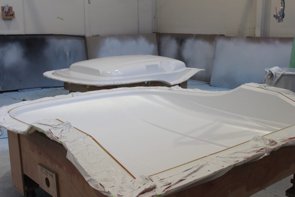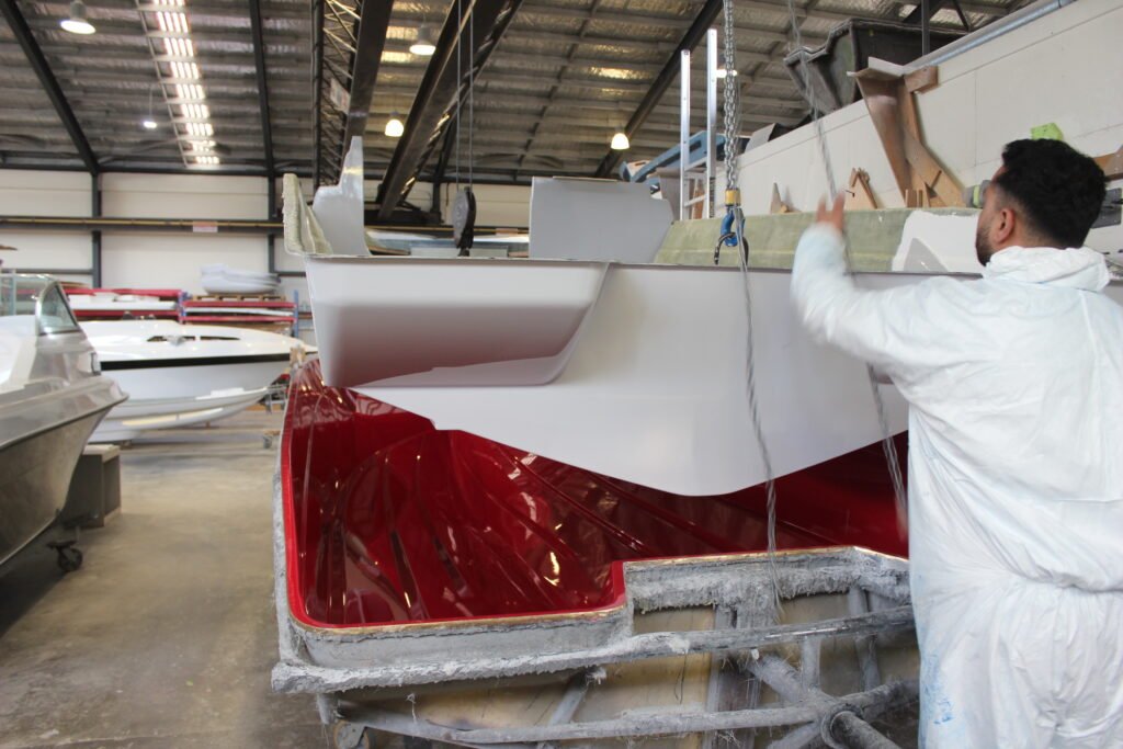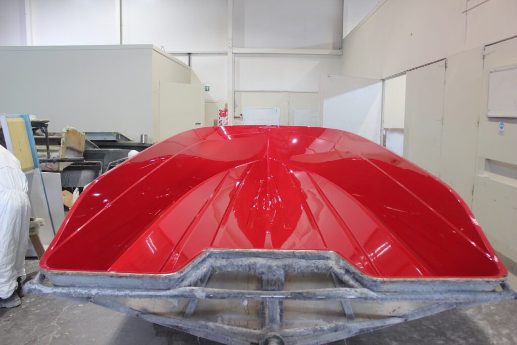Highly polished moulds are used to construct the components for the boat. The first step in building the hull is to spray a layer of gelcoat. Gelcoat not only gives the hull its colour but also provides a hard, protective outer layer that offers years of durability.