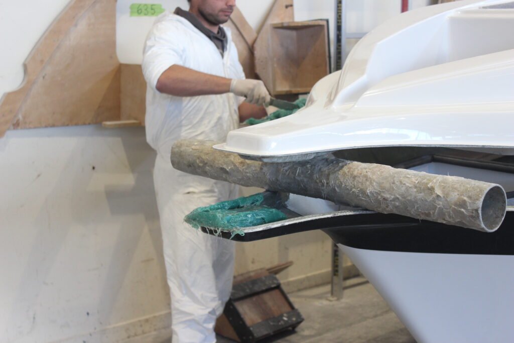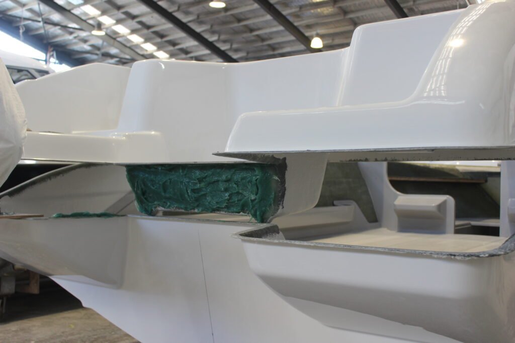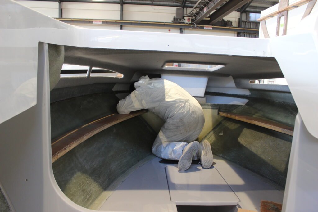 The penultimate step of the process is to clean up the join, remove the excess resin mix and check for and fill any voids. This is done on both the exterior and interior of the boat.
