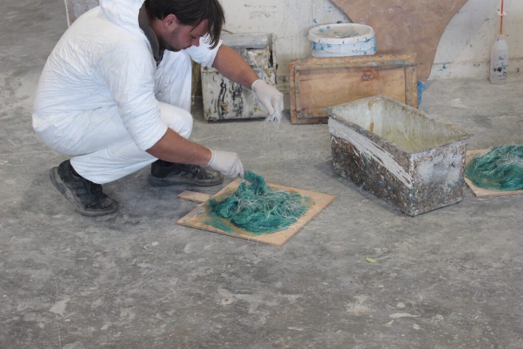 The second layer is a layer of chopped strand mat. Made up of thousands of short, randomly oriented, glass fibre strands. It reinforces the hull skin, bringing it to the required thickness, as per the design specifications.