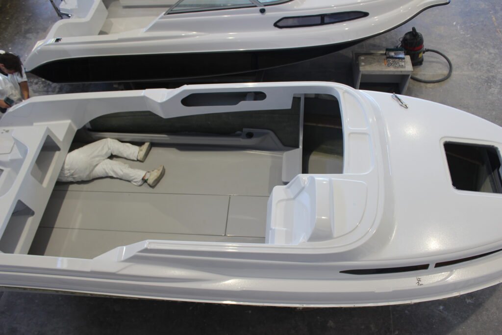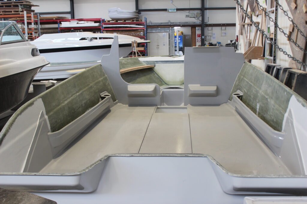 The floors are pre-made in a mould with a gel coat finish. The foam glass composite adds significant stiffness and rigidity to the boat, which in turn improves its performance.