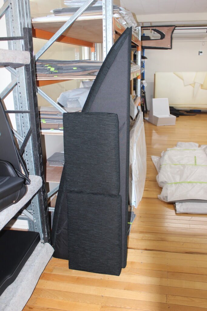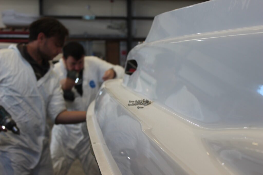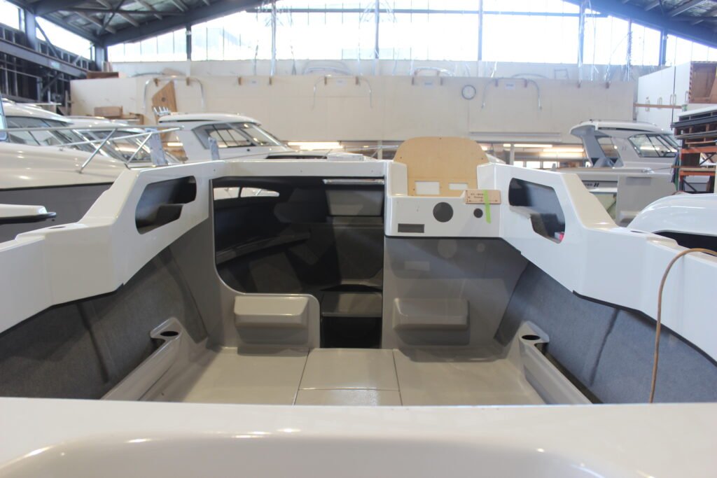 Once the upholstered cockpit and fore cabin side panels are installed, the boat quickly progresses from a bare hull to looking like the finished article. Unusually, upholstery for the side panels is done by the boat builder, highlighting the multiple skills Denis’ team have.