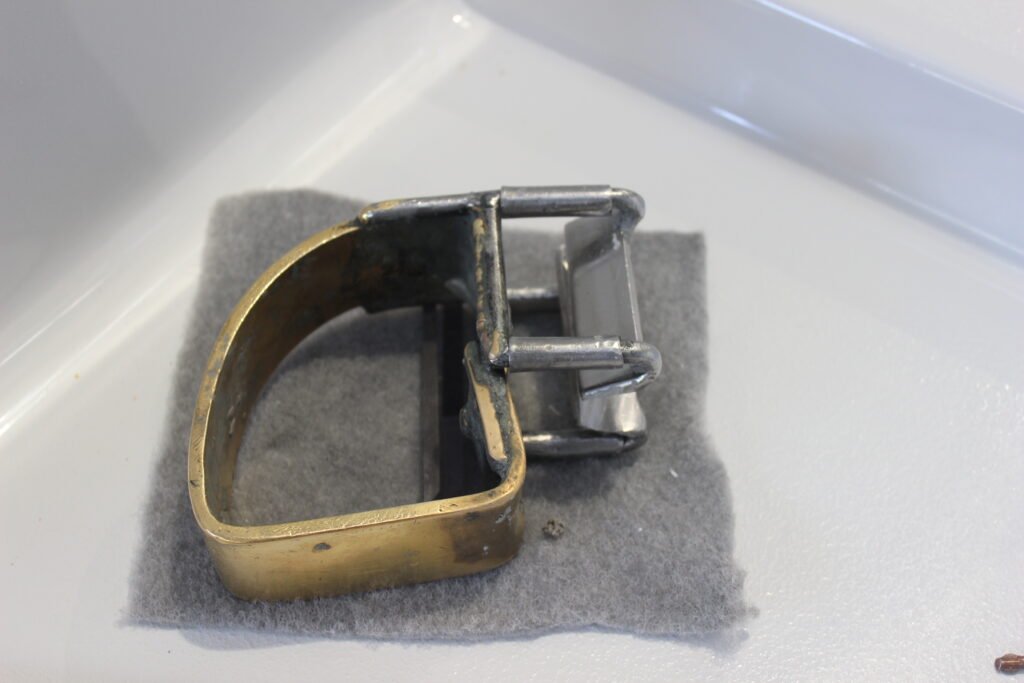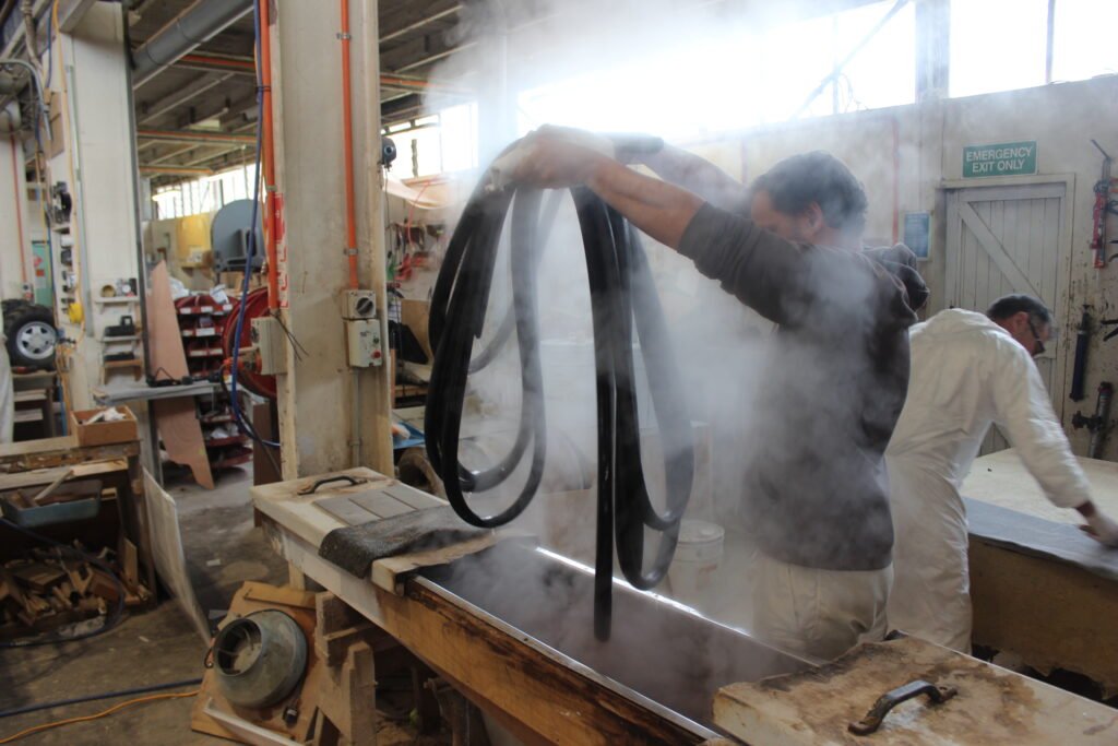 Installing the fender strip is a physically demanding process that requires a team of three. One person is out in front, holding the fender strip and stretching it slightly. This helps the fender conform to the boat’s shape, resulting in a tight, neat fit. The second person uses a specialist tool, made in-house, to push and lock the fender into place. This tool is decades old and has been polished to a high shine purely from all the boat builders who have used it.