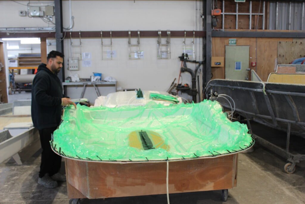 Simultaneously, the bottom mould receives the gel coat, carbon fibre cloth, foam panels and vacuum infusion treatment.
