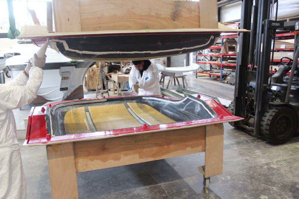 The mould has two parts – the top and the bottom. The process is essentially the same as the hull. First, the gel coat is sprayed into the top section of the mould. Then, the top layer of carbon fibre cloth is laid up, followed by the pre-cut foam core panels. This is then vacuum-infused to ensure the foam and carbon fibre cloth are completely bonded together, keeping the resin used and, thus, the weight within the specified design parameters.