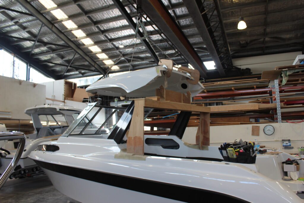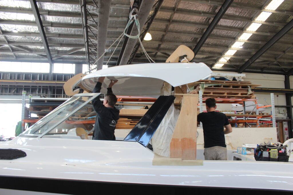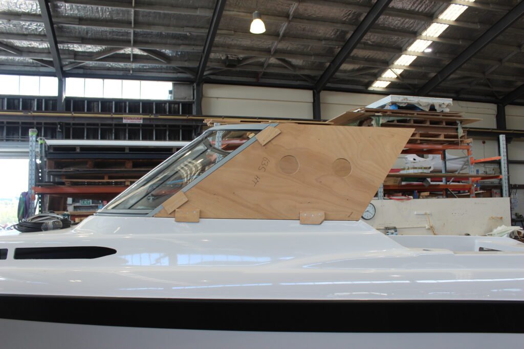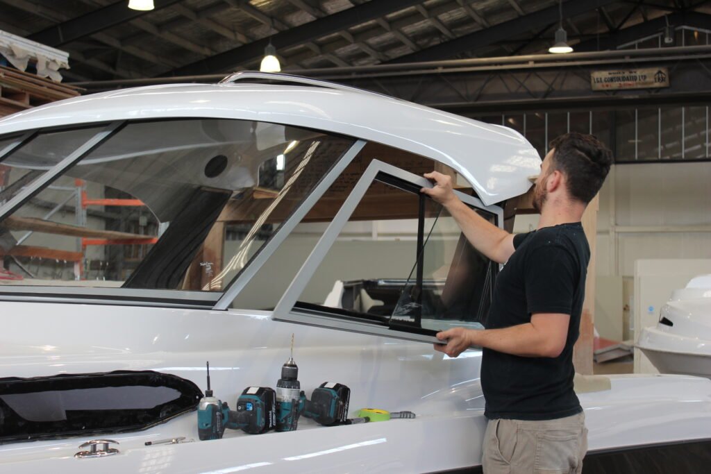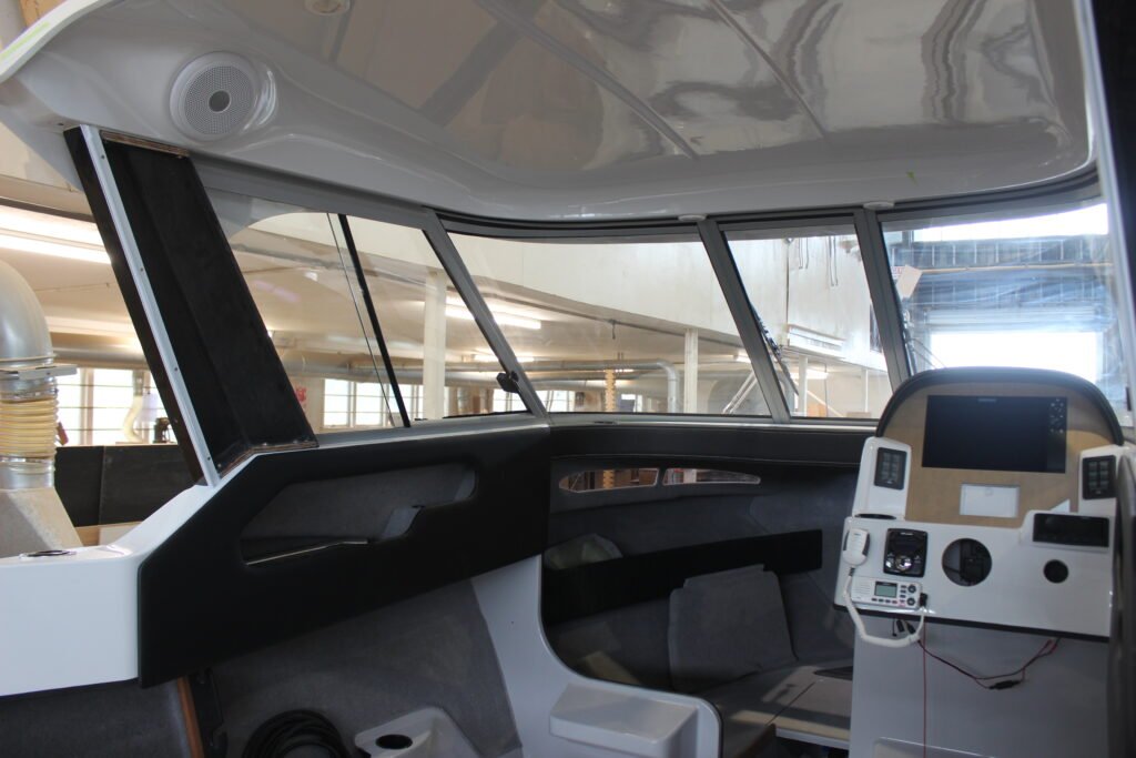 Once the hard top is installed, the sliding side windows are fitted. You will notice a rebate in the support pillar. This neat design element allows the sliding window to open fully; otherwise, it would be no more than a vent. The support pillars double as cable routing conduits for the cabin’s LED lighting and Fusion sound system speakers. Once all the electronics are installed, the side pillars are finished off with exterior and interior white, gel-coated GRP side covers, providing a very clean finish.