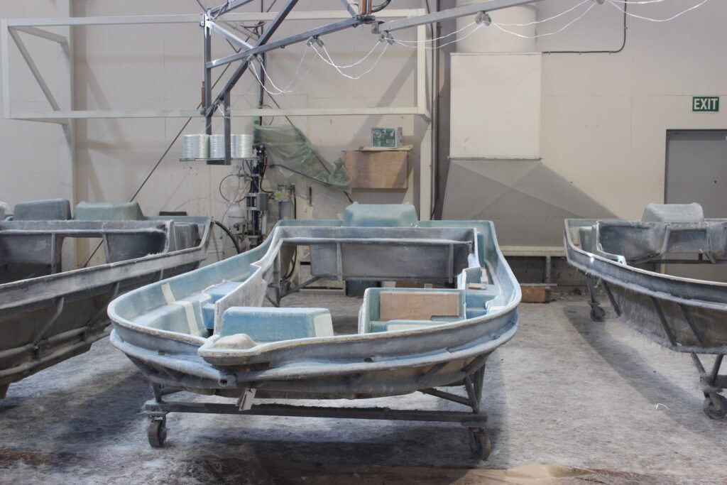The boat is then left to fully cure for 24 hours. While the resin cures, the various holes for instrument panels, steering wheel assembly, motor mounts, fishing rod holders and so on are laid out and cut.