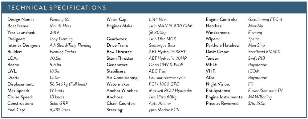 Fleming Yachts Duncan Cowie says that every boat is built to order, so no two are ever the same. “While we have two basic saloon layouts, for example, the owner of Maude Hess has changed the shape of the countertops, lounge layout, added more bookshelves, glass rack and entertainment system. The master cabin was also tweaked with a bulkhead moved aft so he could add a small sofa. Stepping up from a Fleming 55, he knew exactly what he wanted”.