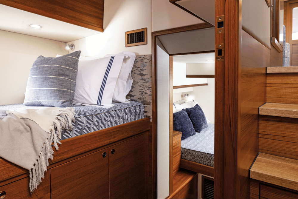 Step aboard, and the first thing that stands out is the high level of finish and craftsmanship. The additional length has created a convenient starboard guest cabin featuring an athwartships double berth, an extra single, and its own ensuite, transforming the GB62 into a genuine three-stateroom, three-head passagemaker. A separate utility space with a washer/dryer adds practicality for extended cruising. The GB62 retains the classic Grand Banks profile: beautiful sheer line, timeless design, and a hull built with the latest construction technology. Expansive walk-around decks, high bulwarks, and solid handholds make movement safe and easy, while the extended boat deck shades the cockpit below, creating a versatile all-weather entertaining area.