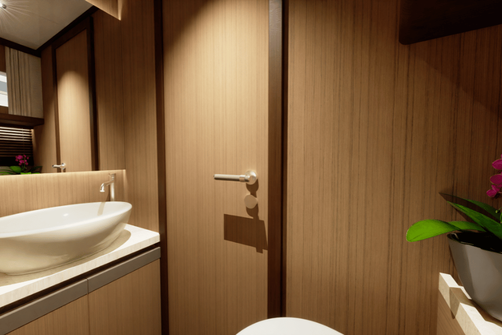The yacht includes up to 4.3 kW of solar power as standard, allowing constant 230V power onboard for comfort and peace on anchor and reducing reliance on generators. When the hybrid system is selected, owners can enjoy the ability to cruise silently at low speeds in electric mode, switching to diesel for longer passages, higher performance and recharging the LiFePo batteries.