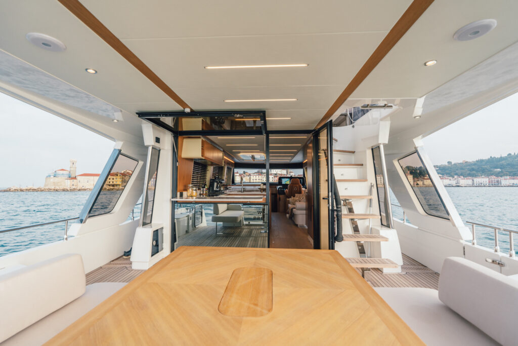 Saloon: A highlight of the 58 Fly is its one-level deck design- not a single step from cockpit to helm. The salon is situated flush with the aft deck and galley, providing unobstructed sightlines and ample headroom. Low side-window sills afford excellent visibility without the need to raise the dining area, ensuring the interior feels both spacious and connected to the outside.