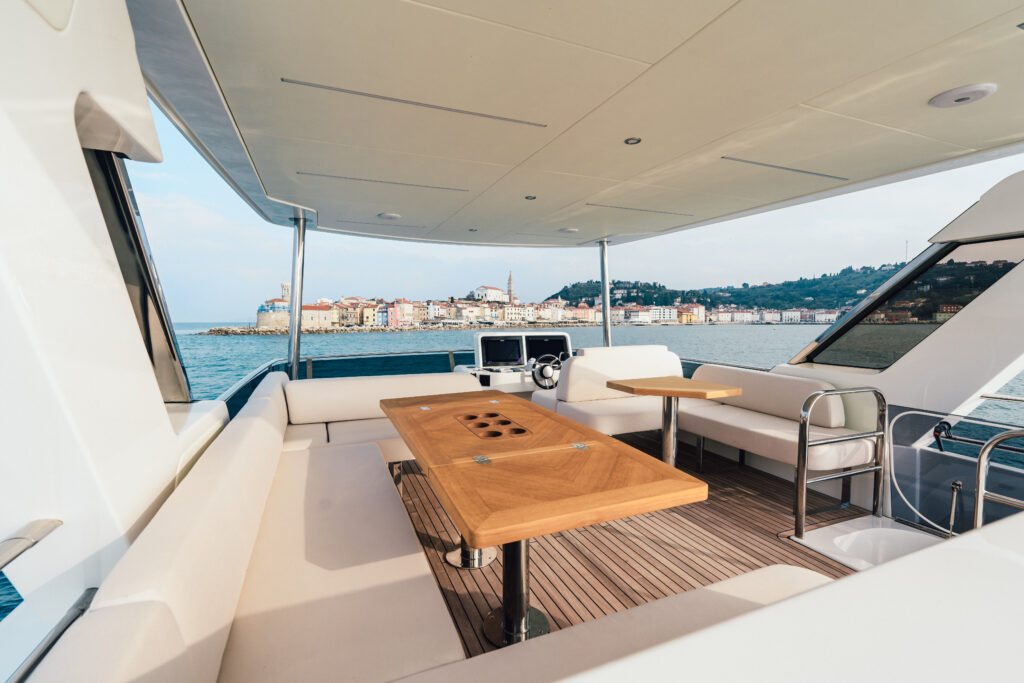 The flybridge extends approximately 7.6 m fore to aft. A hydraulic davit at the aft third accommodates the tender, keeping the swim platform free. Seating includes a port-side wrap-around banquette, a bench with a café table, and two forward-facing fixed benches on the bridge deck. The upper and lower helm layouts mirror each other, and a 5.6m carbon-fibre hardtop provides UV protection while maintaining a low centre of gravity.