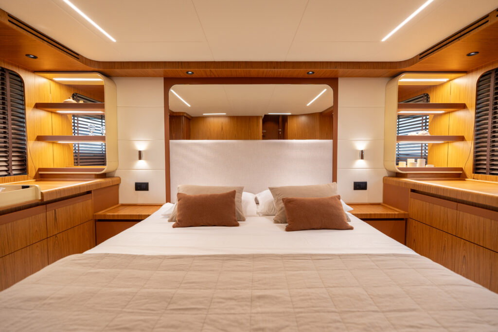 Accommodations: The 58 Fly offers a three-stateroom, three- ensuite-head layout, all surrounded by the vertical-grain rosewood and warm teak woodwork seen in the salon.