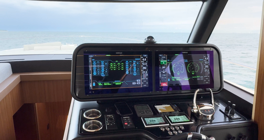 Lower Helm: The helm is thoughtfully laid out. Optional 19” SIMRAD MFDs provide vital system monitoring, while control sticks and bow/stern thrusters are reachable from the side deck. The starboard sliding door enables single-handed tie-up without extra aft-deck controls or remotes.