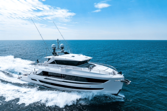 Horizon’s launch of the FD80 Hull 16 marks the first fishing cockpit to be featured in the acclaimed Fast Displacement (FD) Series. Commissioned by boating enthusiasts with a love for the sea and a passion for fishing, this FD80 caters specifically to anglers. It blends luxury and practicality in a four-stateroom-plus-crew layout with generous entertaining spaces. Christened Amethyst, the yacht’s styling pays homage to its namesake. The owners, both born in the month of February and united in a passion for fishing, selected amethyst, their shared birthstone, for personal significance and as a symbol of good fortune. From the exterior, the yacht’s most noticeable feature is the specially fitted outriggers, hinting at a fishing system that brings the excitement of sport fishing to the forefront. Interior-wise, the owners’ affinity for amethyst comes through, reflected in elegant purple accents harmoniously paired with water-bleached walnut finishes. “We were delighted to collaborate with the owners to capture their passion for fishing,” said Horizon Yacht Australia director Mark Western. “The result is a vessel crafted to enable them to embark on adventures where they can experience the exhilarating thrill of reeling in a large catch.”