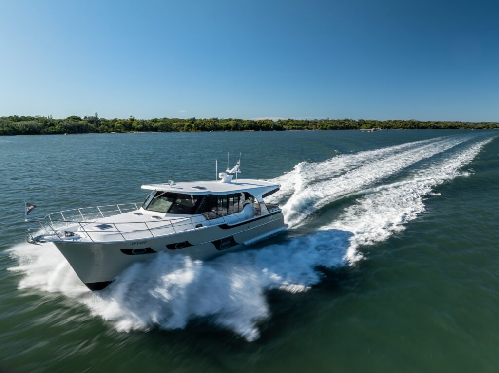 The 520SX Plus is part of the Integrity Plus range, which is the semi-displacement hull. It offers double digit cruising speeds with fuel efficiency, while maintaining the reliability and comfort of previous models. China based Integrity make three ranges: Coastal Plus, Classic and the SX. The latter is aimed at wide range of sailors, but appeals to the discerning boater especially. Sized from the 34-51 foot (340 SX to the 510 SX Flybridge model), the range focusses on functional designs, specifically made for Australian conditions by the Whitehaven Group that commissioned these builds. So, key features are fairly deep hulls with ample shade protection. According to the dealer Spectrum Marine, the Integrity Brand has around 100 boats locally, which are impressive numbers, but after a day spent aboard this versatile 520SX, I can see why.