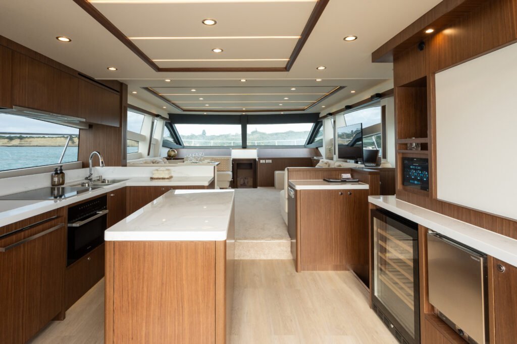 The galley, situated between the main salon and the aft cockpit, is a fully equipped modern kitchen, designed for effortless meal preparation, while ensuring the hosts can enjoy the company of their guests and family while preparing meals.