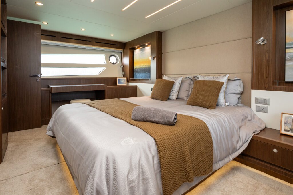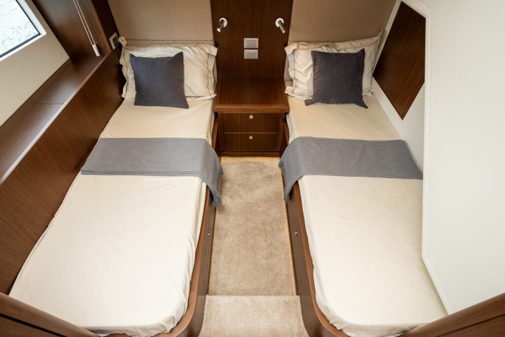 Leading off from the main salon, two separate stairways connect the lower private accommodation areas. One is centrally located and the other, at the aft, starboard end of the salon, both giving access to all three comfortable staterooms and the laundry room, while enhancing ease of movement throughout the boat. Descending the central staircase from the salon, you enter the expansive forward (bow) stateroom. Should you decide to descend to the accommodation level via the other stairway, you will gain separate access to the guest twin berth starboard cabin as well as to the amidships located VIP stateroom.