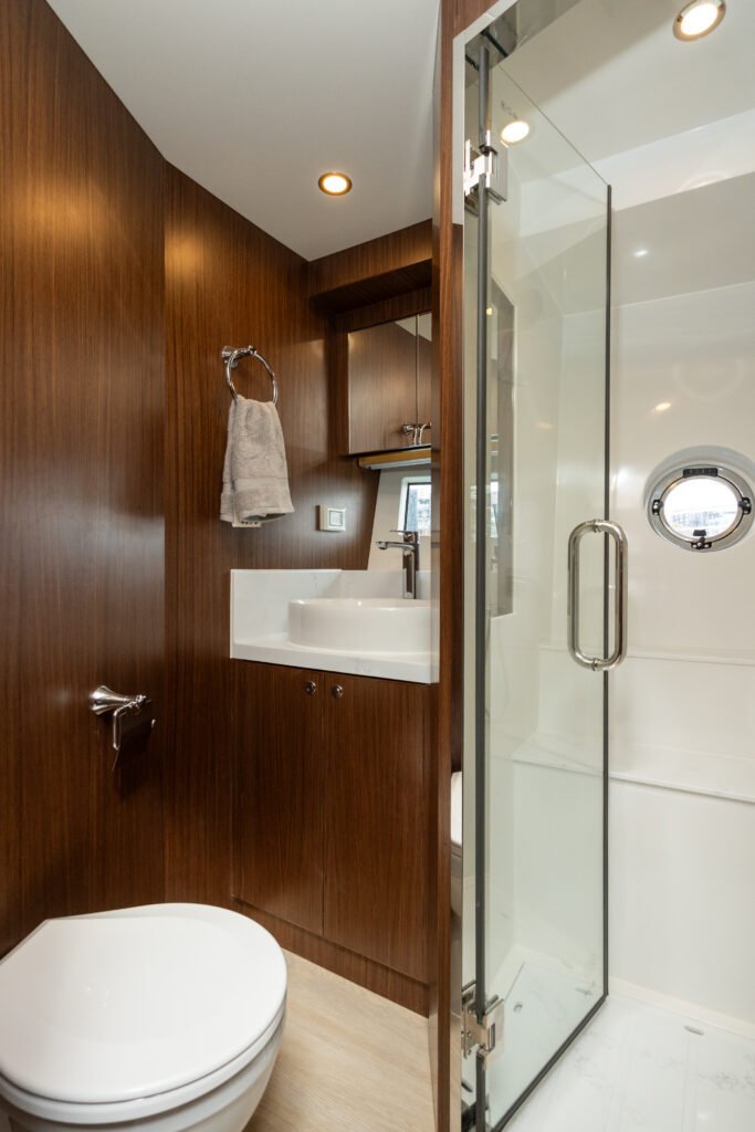 In total, there are three separate bathrooms, all with their own showers and modern fixtures providing privacy and convenience for all on board.