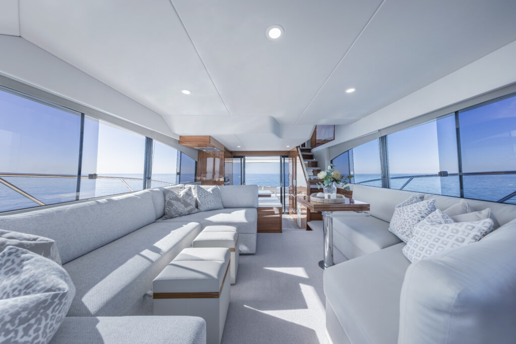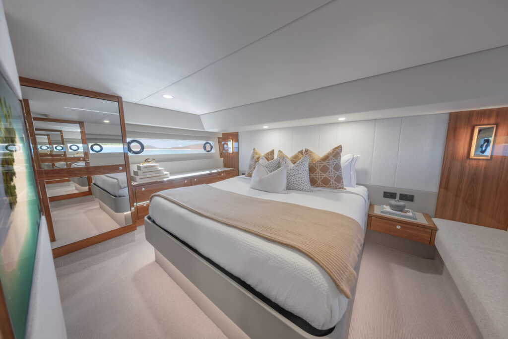 Stepping up from the galley is the saloon where the layout maximises every inch of available space while maintaining comfort. The main cabin features a dining area on the port side, and to the starboard is another lounge with a nifty slide-out bed system that transforms the social area into sleeping quarters when needed. Or perhaps simply a great space to curl up in the sun – a pop-up TV completes the afternoon soporific post-lunch sleeping station. The most surprising, and it must be said the best bit of innovation for me, was the seating design where lower covings provide exceptional visibility throughout the main cabin, so seated guests both in the saloon and in the flybridge have a clear view of their surroundings. (Many designs of vessels that have dispensed with the lower helm have just torn out the helm and left the saloon levels and design as is, leaving poor visibility.)