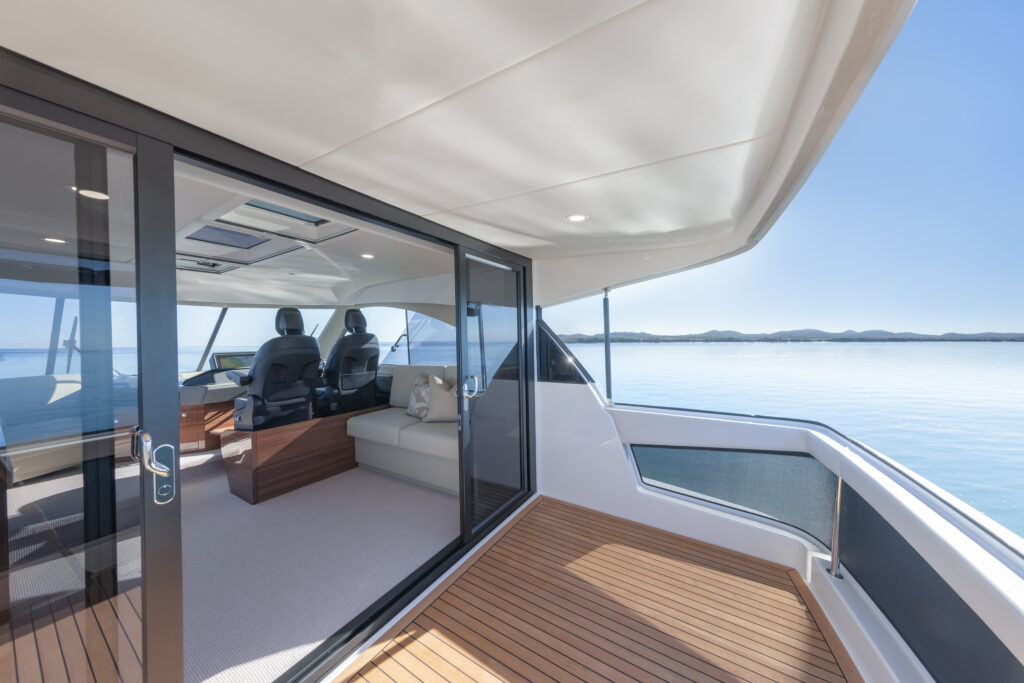 Our tour of the Maritimo M50 Flybridge begins at the stern, with mine host and tour guide General Manager Phil Candler, where the newest feature immediately catches the eye: the high-low platform. This isn’t just any swim platform – it’s a Maritimo-designed and manufactured innovation that represents years of engineering refinement. The platform possesses a unique dual functionality, obviously the ability to go up and down, but what sets it apart is the function to flip up. The engineering brilliance becomes clear as I watch the demonstration. When a tender is secured to the platform, it operates in its traditional horizontal position. But here’s where the genius lies – when no tender is present, the entire platform can flip vertically, reducing the boat’s overall length. This means that the hull goes from a hull ISO length of 16.82 metres down to 15.7 metres. And when deployed, it transforms the back area into a spacious entertainment zone perfect for water activities, integrated with a built-in barbecue, refrigerator and easy access to the lazarette. This seemingly simple innovation also solves a real- world problem that many boat owners face daily – marina berths are expensive, and every foot counts. The ability to take a shorter berth while maintaining full functionality when needed is the kind of practical thinking that defines the brand. It also works as a safety rail while out on the remaining flat piece of the platform, and I am sure, although not demonstrated on the day, would work well in breaking up a wave-pooping situation. But the platform isn’t a one- size-fits-all solution either, with some US customers preferring fixed platforms, while others choose to forgo the platform entirely.