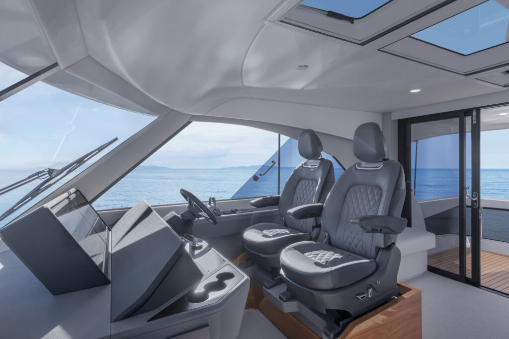 The internal stairwell on the port side leads us up to the flybridge, a big space where they have squeaked around a foot extra each side on the wings. Plenty of large couches sprawl over either side and that view for the passengers is fabulous, all finished with the generous with doors leading out to a balcony. The starboard side is where I find two Garmin 22-inch screens dominating the dashboard, with standalone autopilot, a standalone engine display, and the controls all laid out under the steering. The Yacht Controller compatibility gives you everything you need for long range cruising with a perfect balance between fashion and functionality. The Vetus variable thrusters are all controlled through one control for both bow and stern. The grid can control all the screens, so you don’t need to reach forward. The captain’s seat is near the starboard wall and the solid diamond stitched helm seats are fully electric and adjustable, with a heating function as well.