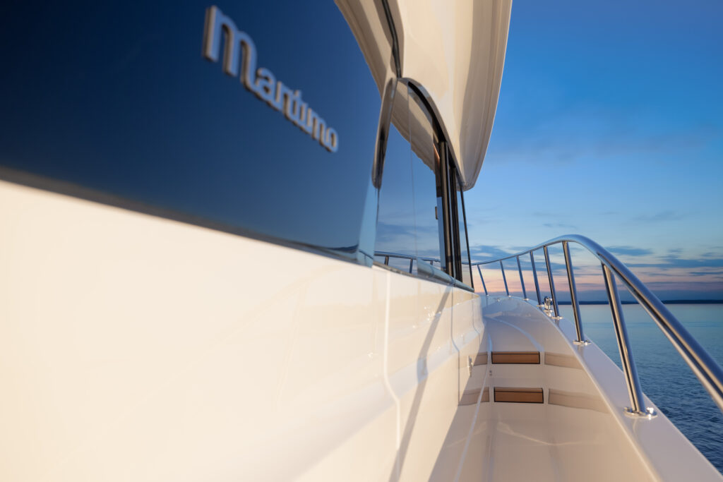 Another significant innovation lies in the quarter panel construction. Unlike traditional designs that require external grills and stainless-steel fittings, Maritimo has integrated the engine room air intake directly into the quarter panel structure. The multi-part panels create clean, flowing lines while ensuring optimal airflow to the engines. This design eliminates potential failure points while reducing maintenance requirements. There are no external grills to corrode, no stainless-steel trim to polish, and no complex routing to service. The air intake sits at the perfect height to avoid water ingestion while maintaining the aesthetic flow of the vessel’s profile.