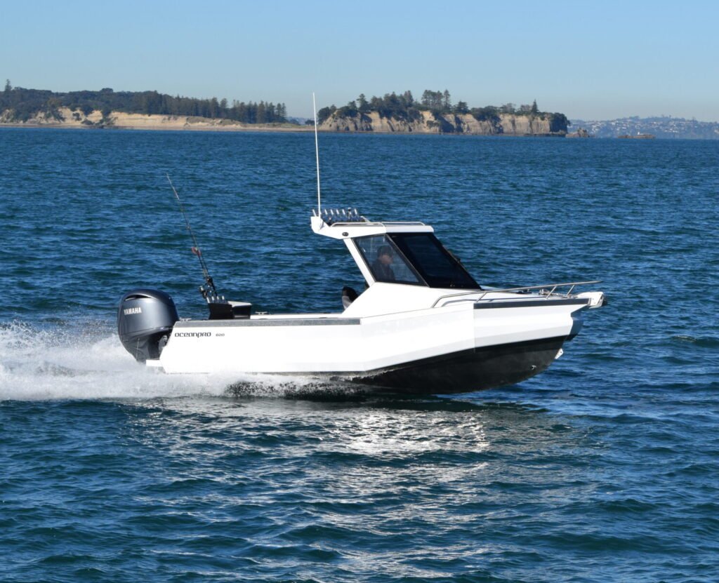 Mike has been a busy builder since that troubled year, developing a range of pontoon boats which continue to impress and in 2024 they have released a couple of new designs, the first being a new hard top model ready for spring, the Oceanpro 620HT. This boat was quickly snapped up by his Auckland dealer, Family Boats who fitted it with a Yamaha F150hp, so I organised to meet up with Mike to take the boat for its first on water run in the gulf.