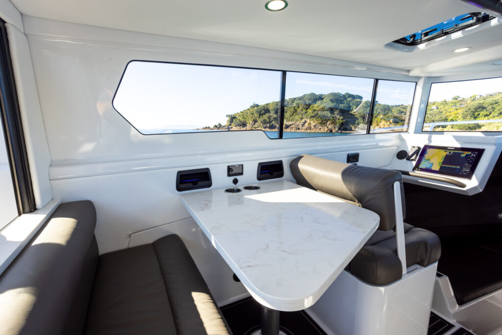 Behind the helm seat is a galley area, which initially appearing to be a bit Spartan, is actually equipped with everything you might expect in the galley of a bigger boat. Aft of the co-pilot chair is a large, combined dining/work table, ample enough to provide enough room for two people to use as a work station, while equally suitable as a dining, entertaining table.