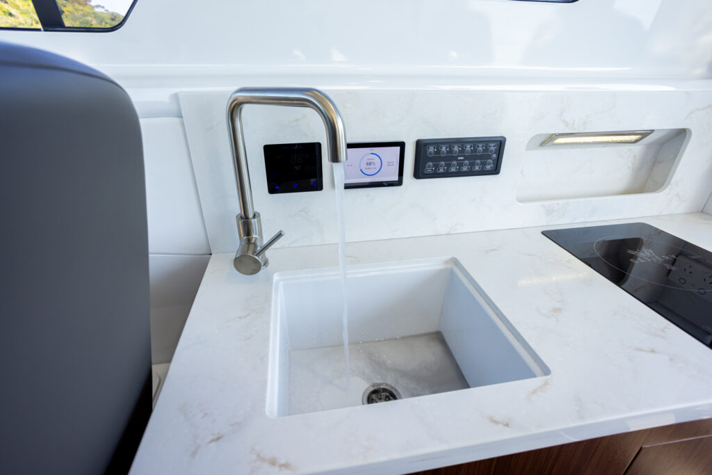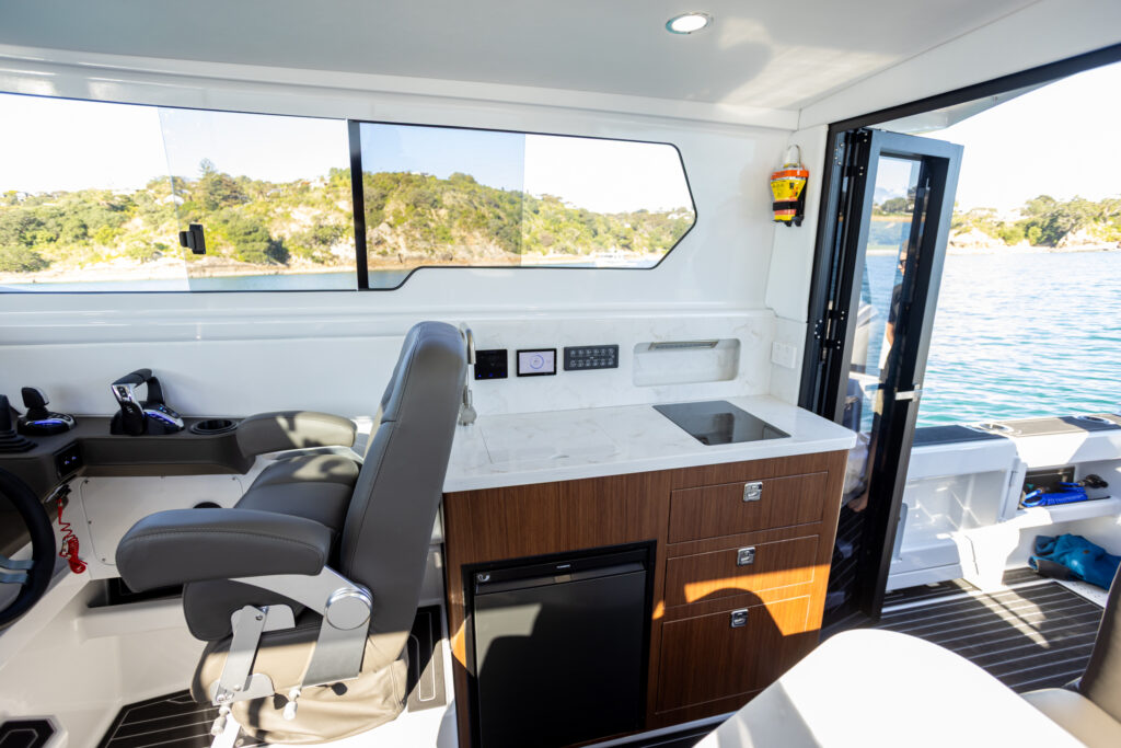 Although this is a comparatively heavy boat for its size, it certainly didn’t seem like it was as substantial or as long as it actually is while you are sitting at the well-laid-out helm station. There is a clear line of sight not only forward, but also to port and starboard. Although at first glance the helm area may seem somewhat intimidating, one soon comes to appreciate that a lot of thought has gone into laying everything out in an ergonomic, instinctive and logical arrangement. Even for an old bugger like me, it didn’t take long to master this control centre.