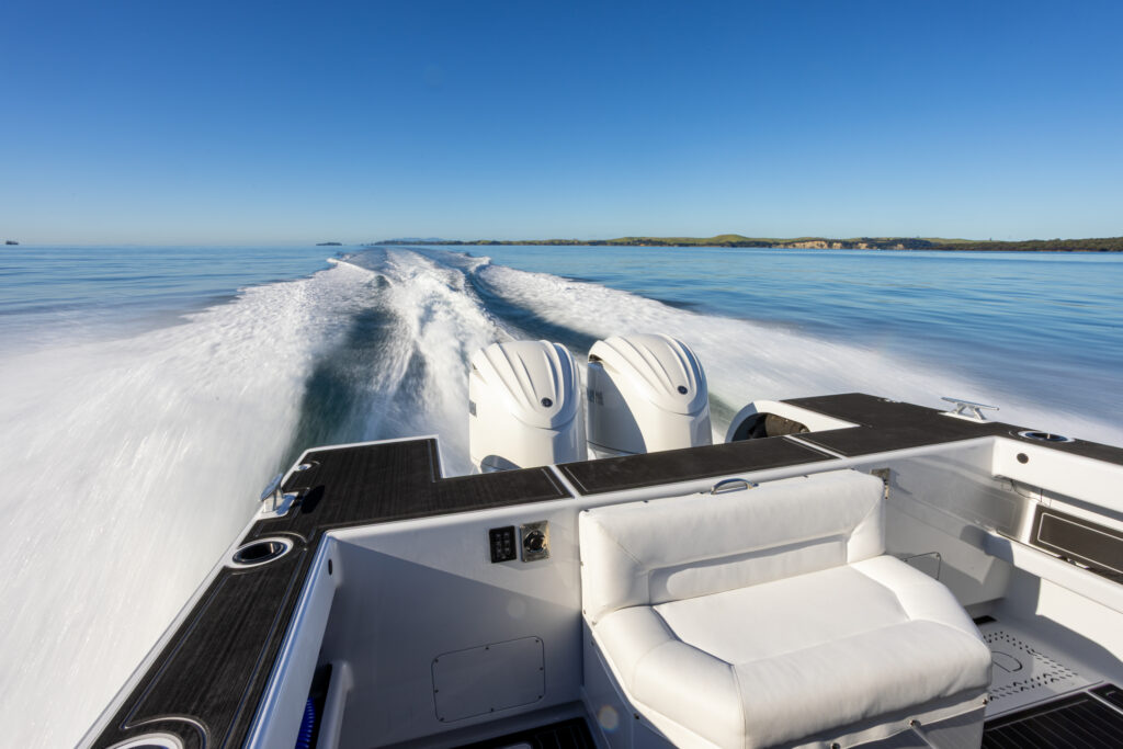 The transformation of the craft from land to water was seamless, and in no time, wheels fully retracted, we were accelerating rapidly out into the Hauraki Gulf, the twin Yamaha 300’s pushing this large and somewhat heavy craft smoothly onto the plane. One interesting thing I noted as I glanced astern once up on the plane was that the stern wheels, when fully retracted, tuck into their own wheel wells, giving the boat a clean, clutter-free appearance. Obviously, the boat builder and engine supplier had worked out the perfect power units for this vessel. As in Goldilocks and the Three Bears; not to small, not too large – just right.