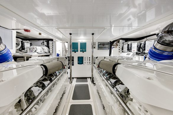 A pair of MAN V12-1200s sit neatly in a Riviera 78 Motor Yacht