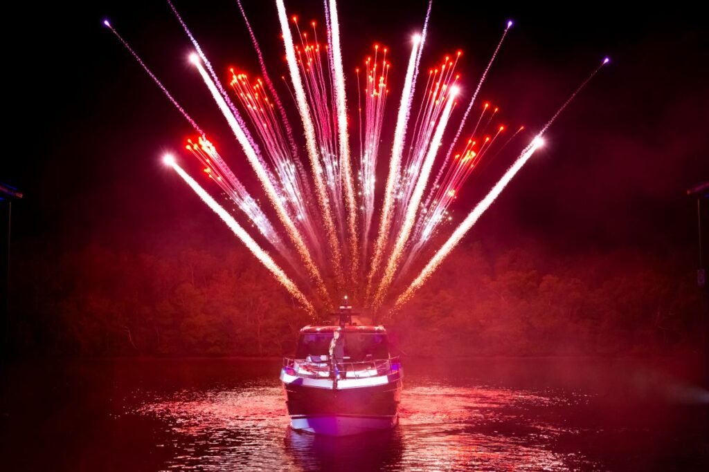 Riviera owner Rodney Longhurst welcomed guests, many of whom had travelled from Canada, the Americas, New Zealand and across Australia to attend the exclusive evening. With a saxophonist performing from the bow and spotlights dancing across the water, Hull No.1 made a dramatic entrance amid a fireworks display, executing an effortless rotation before docking at the Riviera Yacht Club, the brand’s private waterfront owners’ venue.