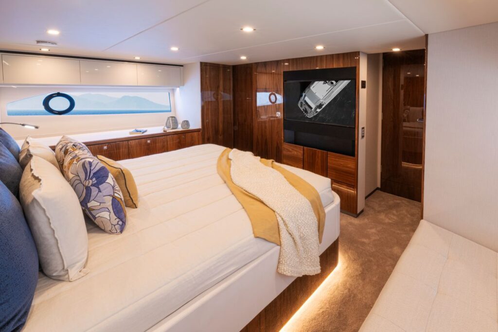 The forward VIP stateroom offers a queen island bed, ensuite bathroom, generous storage and refined finishes. The port guest cabin features electrically sliding beds that convert from twins to a double, sharing the VIP ensuite via a private day-head entry.