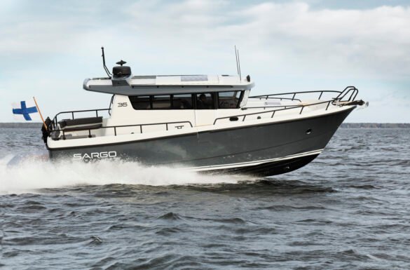 Rapid acceleration, quiet and soft-riding, superb handling, smooth helm – those are stand-out qualities of the Sargo 36, The AllSeason Boat, from Finland. They attracted Leighton Henshaw, co-principal of European Marine in Christchurch, when he was looking for a boat for his young family and for the New Zealand market. After canvassing several Europe-based brands, he selected the Sargo. ‘My wife and I have two children aged two and five years old,’ Henshaw says. ‘We were looking for a boat that had a walkaround style, nice high rails, two cabins with two heads if needed, and a boat that could cope with New Zealand seas so we were looking for a deep vee hull and a sea-kindly hull.’ The Sargo 36 met his wishlist, along with his requirements for easy manoeuvrability, thanks to its powerful bow thruster as standard and twin sterndrives, and the economy of diesel engines while delivering on speed: the Sargo 36 cruises comfortably at 28 knots and tops out at 41 knots.