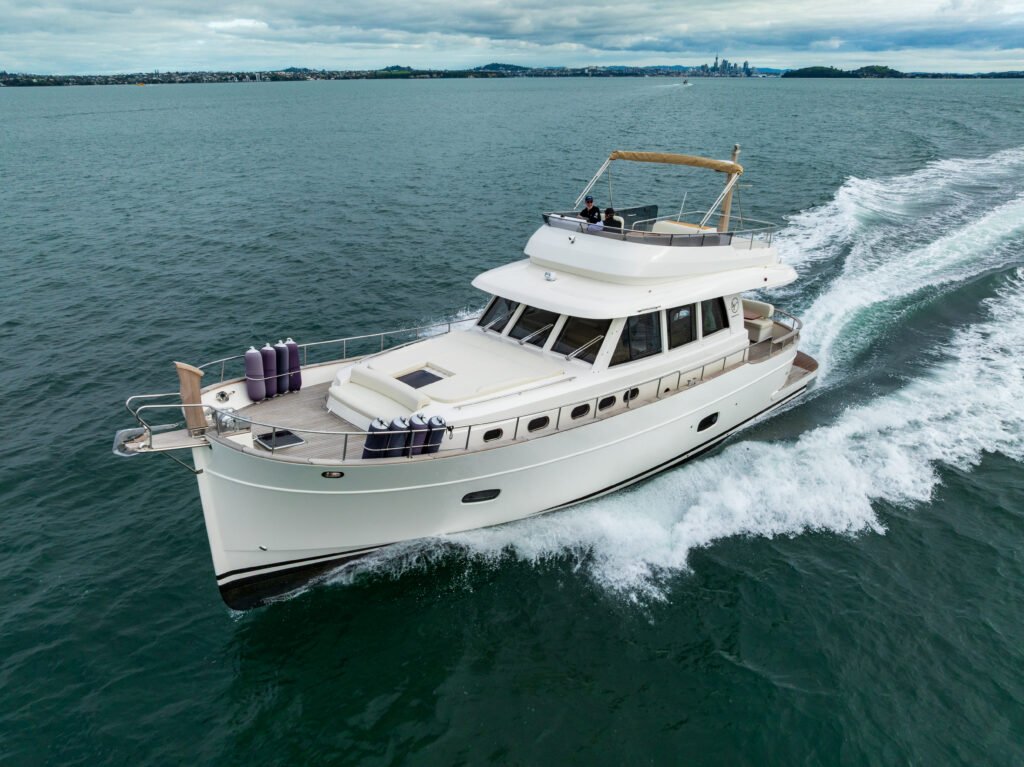 Although we were fortunate to have ‘pink gin’ conditions (i.e. pretty calm seas) on test day, there was ample time to motor around the inner Hauraki Gulf for several hours and put the craft through her paces. The 55 FB hull is a semi-displacement design, featuring a long waterline and fine entry forward, which makes it easy to drive. Despite its 18,500 kg displacement, it cruises comfortably in the 14 to 18 knot range with optimal fuel consumption. With the fuel tanks holding 2800 litres, that’s a possible cruising range of over 400 nautical miles and even more at a comfortable 10 knots.