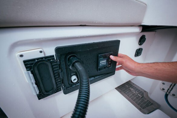 The ATMOS air station can deliver up to 20PSI and automatically switches from the HVLP pump to the HPLV pump at 1.1PSI. The attractive ATMOS unit features Soft Touch TPE buttons with a non-slip texture that provides a tactile surface and that’s easy to use even with wet hands or in inclement weather. ATMOS’s bright, cutting-edge LCD display boasts extra wide viewing angles providing a great view of the screen from anywhere on board, even on the brightest days. A helpful Live Voltage readout also makes it easy to keep track of the boat’s battery health.